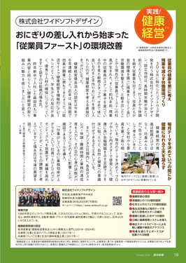 ⽇本⽣命保険相互会社の情報誌『経営情報』の「実践!健康経営」に掲載されました 2024.09.18 ⽇本⽣命保険相互会社の情報誌『経営情報』(2024年 10⽉号 発⾏:株式会社星和ビジネスリンク)にて、弊社が取材を受けました。 『経営情報』は 1970 年の創刊以来、中⼩企業の経営者向けに、注⽬のテーマについて発信を続けている⽉刊誌で、全国の営業担当の⽅より顧客の⽅々へ配布されています。