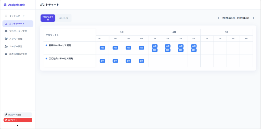 ガントチャートで、どの期間に誰がどのプロジェクトに入っているのかを表示してほしい。」